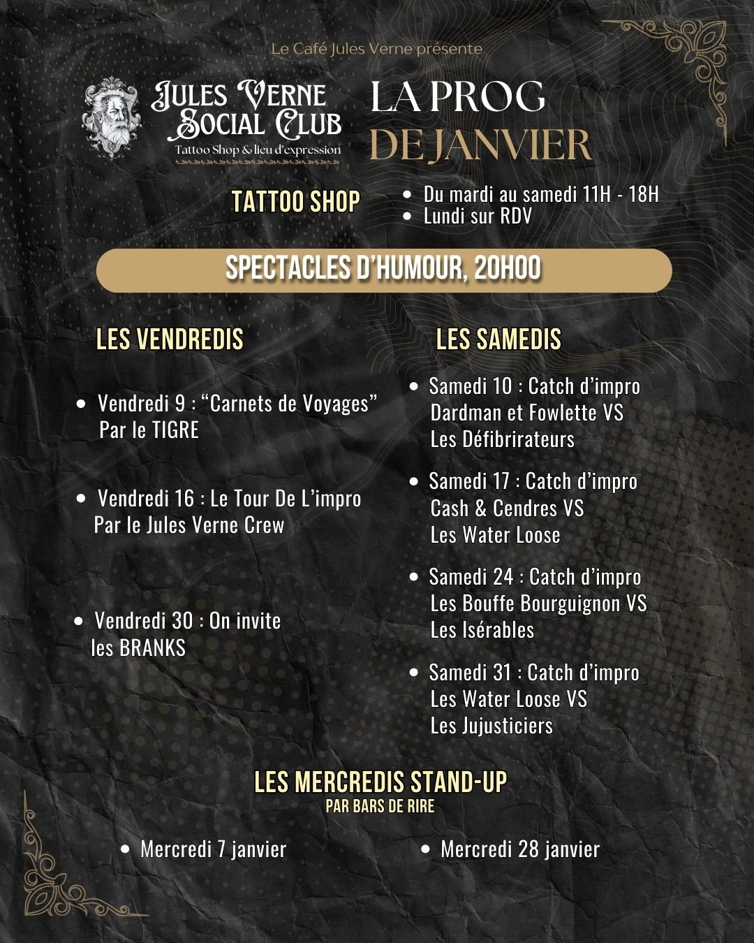 Le jules verne social club, tattoo shop, tiers lieux, salle de spectacle d’humour, impro et stand up, cours d’impro, théâtre d’improvisation et autres activités culturelles à grenoble